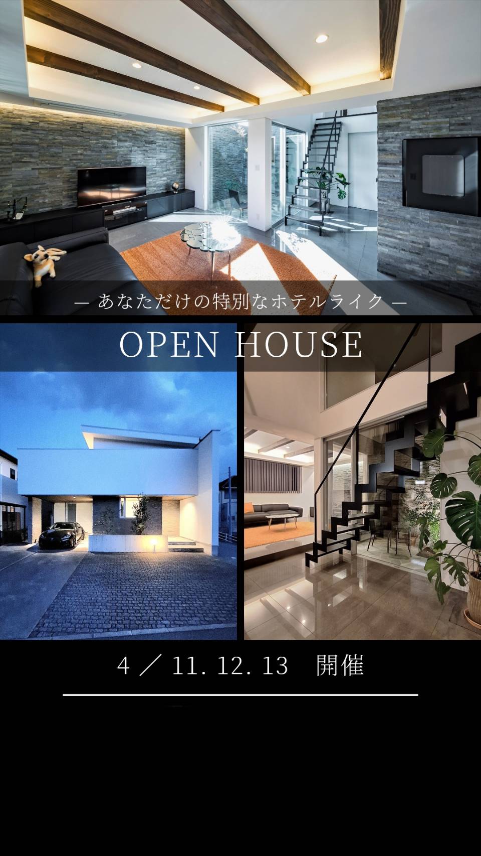 「ホテルライクな暮らし」をコンセプトに!豪華で開放的なインテリア、家族やゲストとの優雅な時間、美食とワインを楽しむシーンが描かれています。